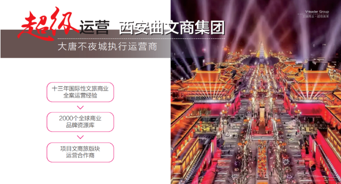 西安曲江文商商業(yè)運(yùn)營管理有限公司(以下簡稱曲江文商商管)是一家專注于商業(yè)地產(chǎn)運(yùn)營管理的公司,有著十三年豐富的全國文旅商業(yè)的運(yùn)營經(jīng)驗(yàn),隸屬于西安曲江文化產(chǎn)業(yè)投資(集團(tuán))有限公司,業(yè)務(wù)覆蓋陜甘、河北、重慶、湖北和江浙地區(qū)。公司以“文創(chuàng)”、“文演”、“文游”、“文娛”、“文食”、“文旅”和“文玩”七大核心開創(chuàng)城市文旅生活,在文商綜合體領(lǐng)域具備獨(dú)特的競爭優(yōu)勢。從西安標(biāo)志性文化旅游項(xiàng)目大唐不夜城大的執(zhí)行運(yùn)營到芙蓉新天地文旅街的西安文旅城市新名片,曲江文商正以其超強(qiáng)的運(yùn)營管理能力,助力一個又一個項(xiàng)目成功。