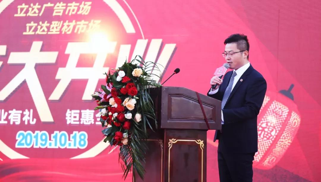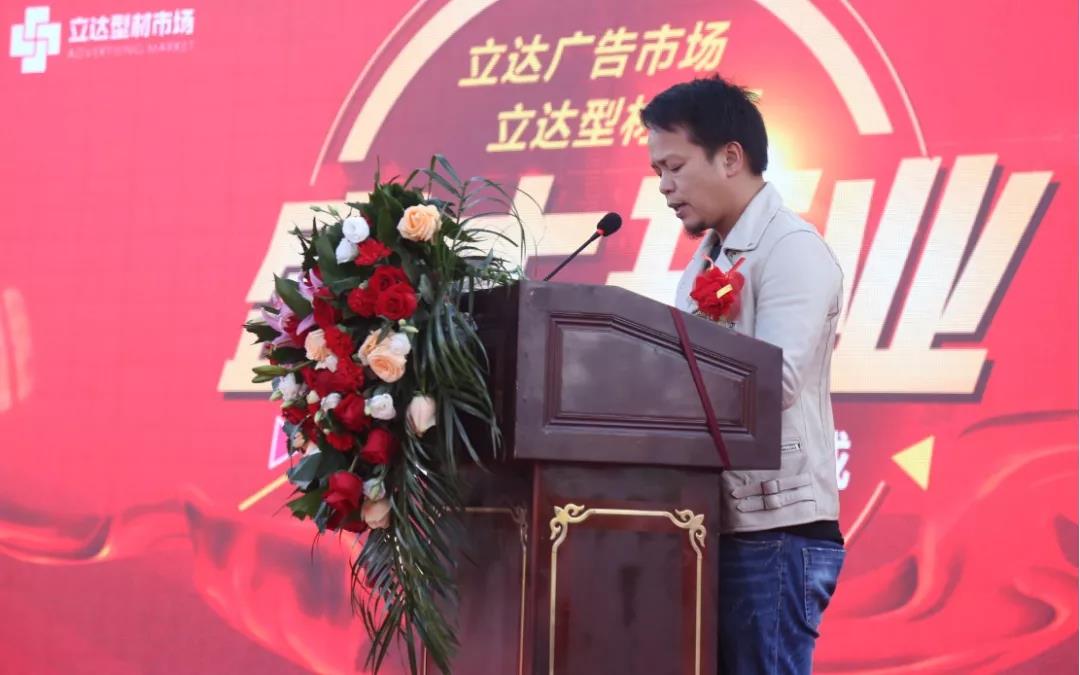 立達型材廣告市場商戶代表金港廣告標(biāo)識總經(jīng)理周圣飚先生致辭,周總回顧結(jié)緣立達及見證立達型材廣告市場的一路發(fā)展,同時他表示,在興慶區(qū)整治散亂污企業(yè)的背景下,立達為重振銀川商貿(mào)批發(fā)業(yè)所作出的貢獻與成績是有目共睹的。立達型材廣告市場為廣大經(jīng)營商戶提供了優(yōu)質(zhì)的發(fā)展平臺,他呼吁行業(yè)同仁緊抓當(dāng)前發(fā)展機遇,積極配合市場運營,共同謀劃發(fā)展之路。與立達一道將市場打造成銀川地區(qū)規(guī)模最大、品類最全、運營最規(guī)范、交易量最高的型材廣告專業(yè)市場。