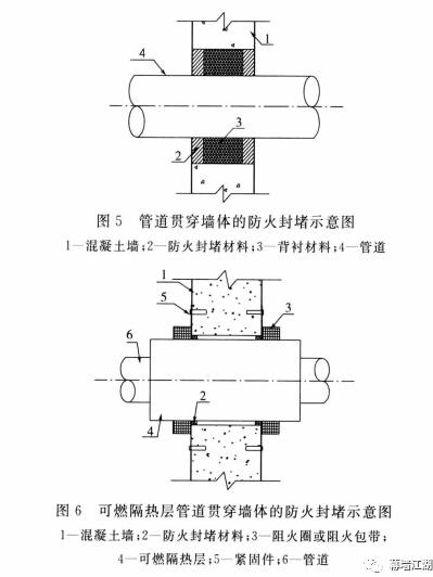 3 當在無絕熱層的管道貫穿部位附近存在可燃物時,被貫穿體兩側(cè)長度各不小于1.0m范圍內(nèi)的管道還應(yīng)采取防火隔熱防護措施。