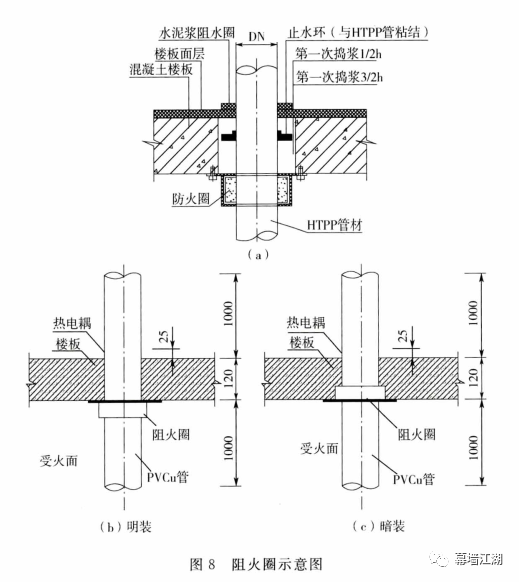 3.0.11 阻火圈或阻火包帶安裝時,是將阻火圈或阻火包帶套在或纏繞在硬聚氯乙烯等塑料管道外壁上。火災(zāi)時,阻火圈或阻火包帶的阻燃膨脹芯材受熱迅速膨脹后擠壓管道,使貫穿孔口被封堵,起到阻止火勢和煙氣沿?zé)g的管道蔓延的作用。阻火圈或阻火包帶有明裝和暗裝兩種安裝方式,但水平貫穿墻體等的孔口的封堵應(yīng)在墻的兩側(cè)都設(shè)置阻火圈或阻火包帶,豎向貫穿樓板等的孔口的封堵,則宜在樓板下側(cè)設(shè)置阻火圈或阻火包帶。